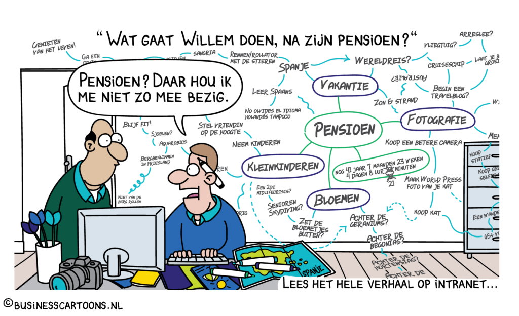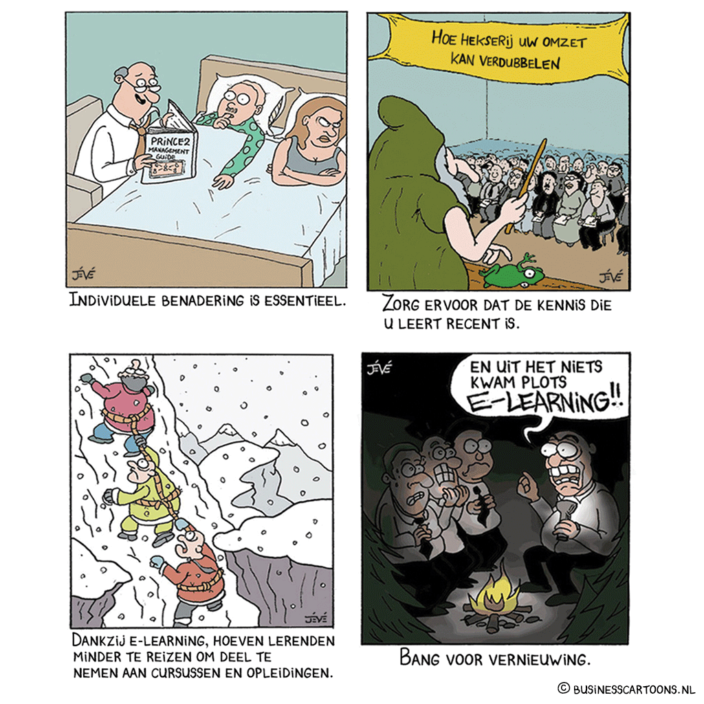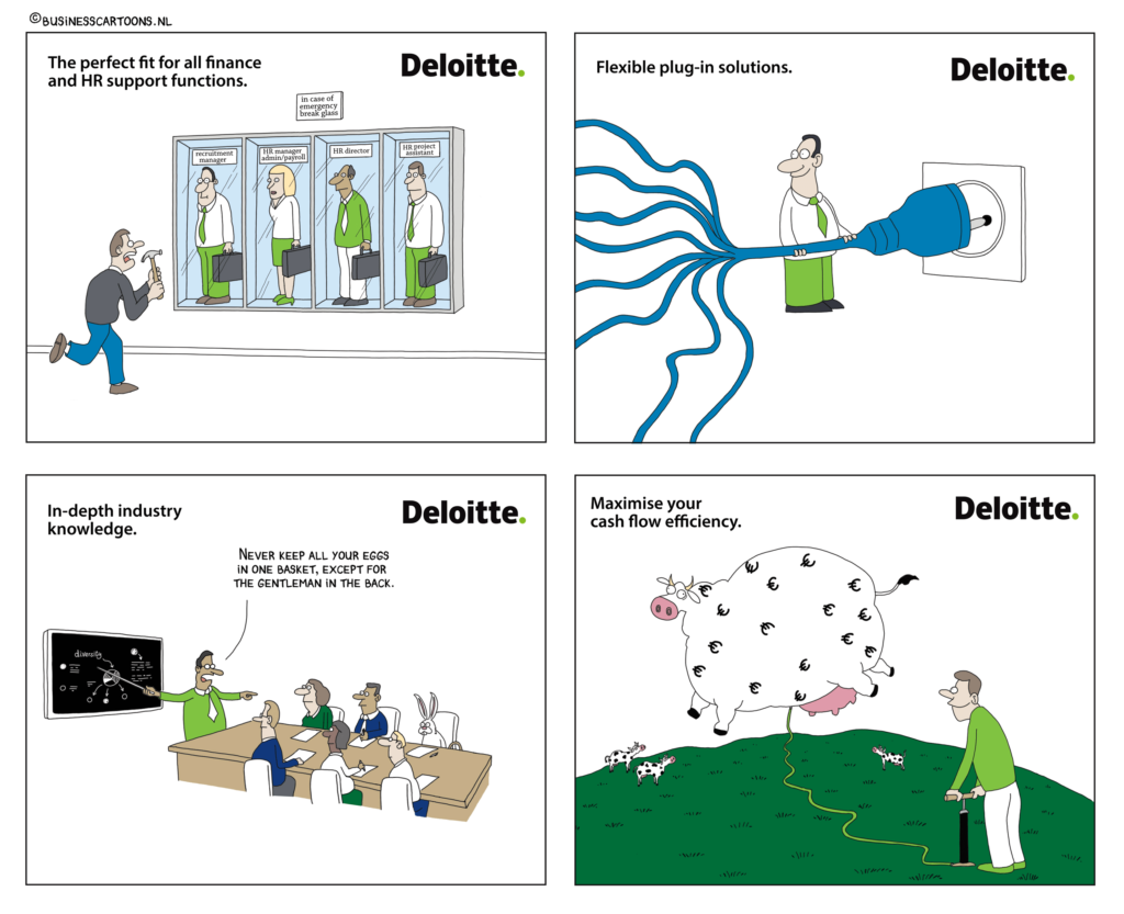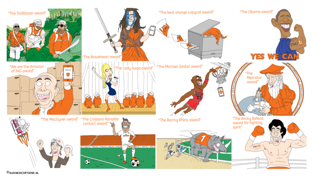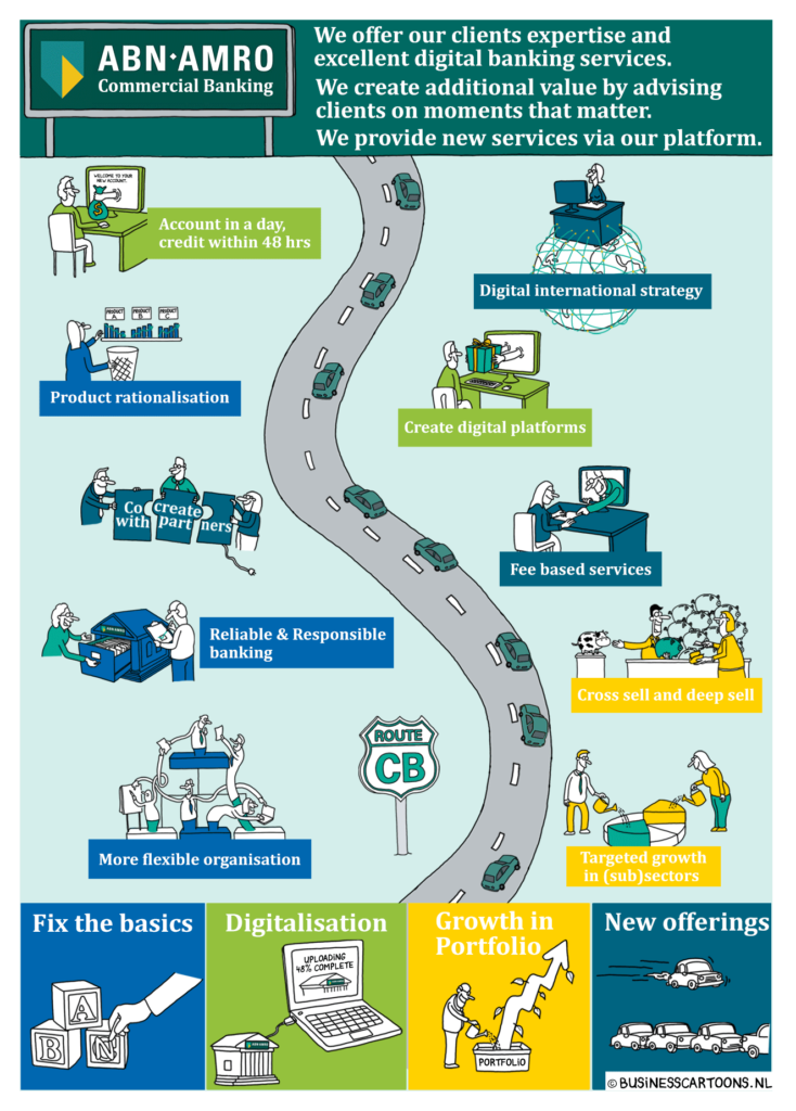 Cartoon Blanche helpt bedrijven en overheid om kernwaarden, strategieën en aankomende veranderingen in cartoontekeningen te communiceren.