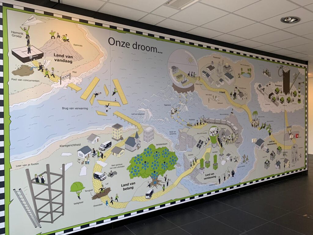 De cartoon-infographic is een poster die een richtlijn uitbeeldt. Dit kan een route zijn die op een luchtige wijze uw visie vertelt. De cartoon informeert en inspireert, eentje om voor een langere tijd op te hangen, zodat iedereen het kan blijven zien.